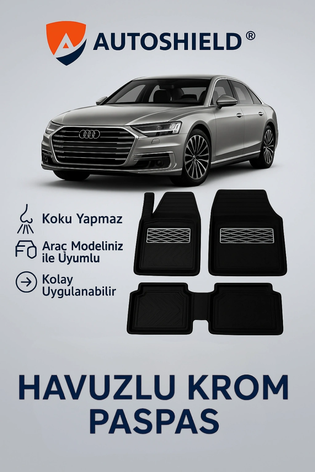 Audi A8 zarif ve sportif iç tasarımına uyum sağlayan krom karbon yüzey dokusu, şıklığı ön plana çıkarırken derin havuzlu yapısı ile dört mevsim maksimum koruma sağlar. Yağmur, kar, çamur ve toz gibi dış etkenleri paspas içerisinde hapsederek araç zeminine ulaşmasını engeller.