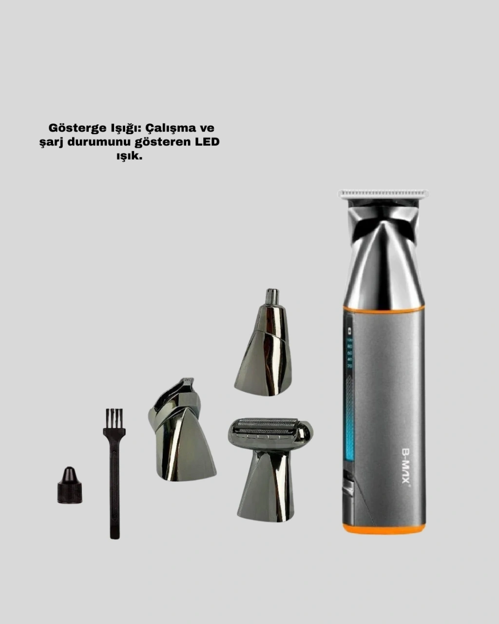 9’u 1 arada çoklu bakım seti, erkek kişisel bakımını daha kolay, hızlı ve profesyonel hale getirmek için tasarlanmış kapsamlı bir çözümdür. Paslanmaz çelik bıçakları sayesinde her kullanımda keskin ve net bir kesim performansı sunar. Güçlü motor yapısı, kalın saç ve sakal yapılarında bile zorlanmadan çalışır.Cihazın 600 mAh lityum pili tam şarj olduğunda yaklaşık 90 dakika kesintisiz kullanım sağlar. USB şarj özelliği sayesinde ofiste, evde veya seyahatlerde rahatlıkla şarj edilebilir. LED ışığı şarj durumunu ve çalışma modunu gösterir.Set içerisindeki farklı başlıklar; saç kesimi, sakal düzenleme, detay kesimi, ense tıraşı ve burun–kulak tüy temizliği gibi pek çok ihtiyacınıza yönelik tasarlanmıştır. Farklı uzunluklar için tercih edebileceğiniz taraklar da pakete dahildir.Başlıkların yıkanabilir olması hijyenik kullanım sunar. Seyahat çantasıyla tüm atları düzenli taşıyabilirsiniz. Hem günlük hem profesyonel kullanım için uygun, kaliteli bir erkek bakım setidir.