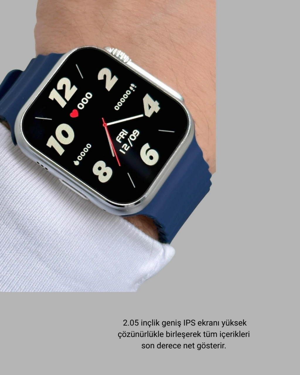 Bu akıllı saat, modern tasarımı ve gelişmiş özellikleri ile günlük yaşamı organize etmek ve sağlık takibini kolaylaştırmak isteyenler için kapsamlı bir çözüm sunar. 2.05 inçlik geniş IPS ekranı yüksek çözünürlükle birleşerek tüm içerikleri son derece net gösterir. 2.5D kavisli cam, saate hem zarif bir görünüm kazandırır hem de dayanıklılığı artırır.Metal alaşımlı gövde yapısı sağlam bir kullanım sunarken silikon kayış günlük yaşamda bileğe konforlu bir uyum sağlar. Yaklaşık 50 gram ağırlığındaki hafif yapısı ile uzun süre bilekte kaldığında rahatsız etmez. Üç yan tuş, pratik kullanım deneyimi için tasarlanmıştır.IP67 su geçirmezlik özelliği, gündelik kullanımda su sıçramalarına ve terlemeye karşı koruma sunar. Sağlık özellikleri arasında 24 saat kalp atış hızı ölçümü, oksijen seviyesi analizi, tansiyon ölçümü, adım ölçer, kalori takibi ve uyku analizi gibi birçok gelişmiş sensör yer alır. Uyku monitörü; hafif uyku, derin uyku ve toplam uyku süresini ölçerek daha bilinçli bir uyku düzeni oluşturmanızı sağlar.Bluetooth arama özelliği sayesinde telefon görüşmelerini direkt saat üzerinden gerçekleştirebilirsiniz. Spor modları yürüyüş, koşu, bisiklet ve daha birçok aktiviteyi ölçerek spor performansınızı takip etmenize yardımcı olur.Müzik kontrolü, hava durumu, telefon bulma, takvim, mesaj bildirimleri, alarm ve zamanlayıcı gibi birçok fonksiyon günlük yaşamı kolaylaştırır. 360 mAh bataryası günlük kullanımda 3–5 gün çalışabilir ve 7 güne kadar bekleme süresi sunar.Şık tasarımı, büyük ekranı, güçlü sağlık takip sistemleri ve Bluetooth arama özelliği ile bu akıllı saat hem iş hem spor hem de günlük kullanım için ideal bir teknolojik yardımcıdır.