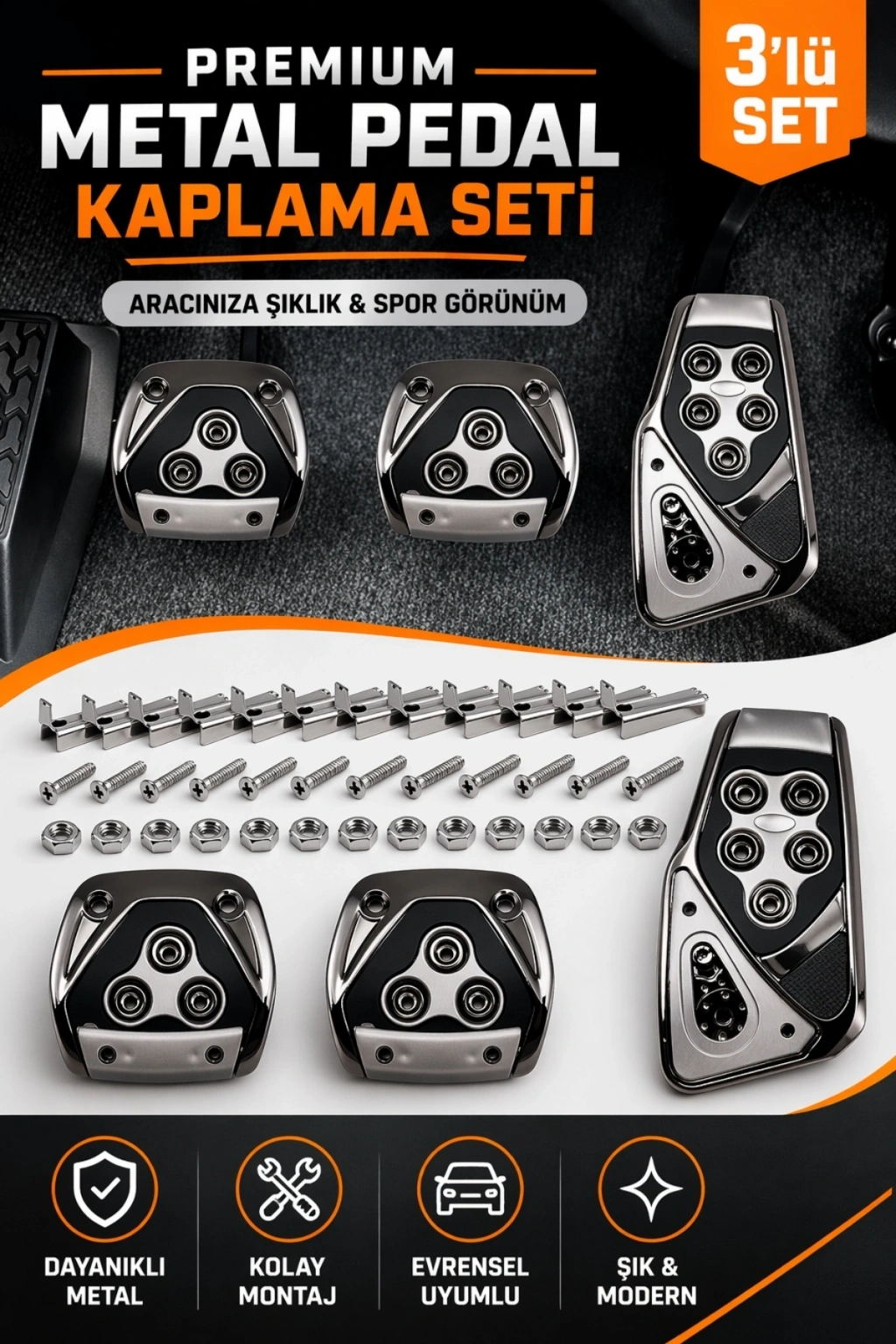 Siyah renkte üretilmiş olan 3 parçalı set; gaz, fren ve debriyaj pedallarını kapsar.